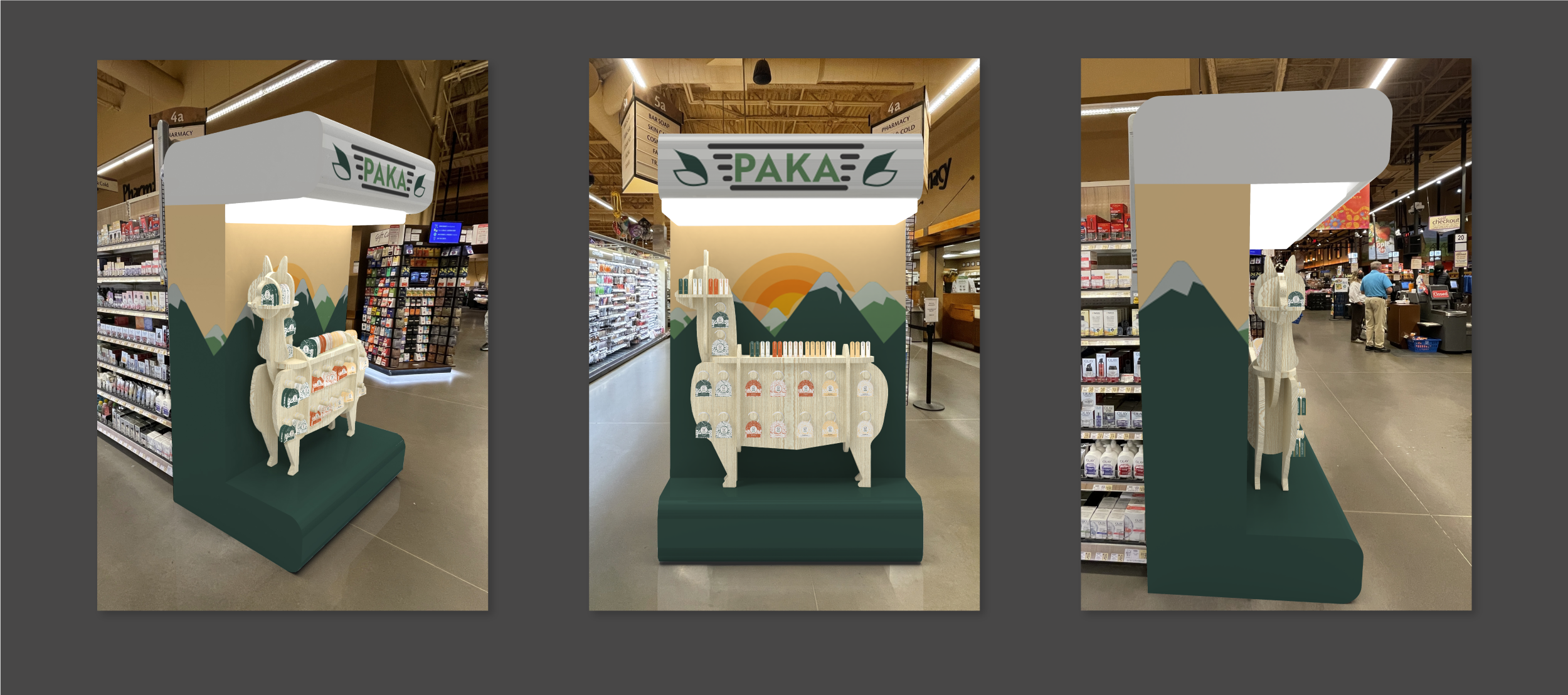 We designed an endcap to showcase our product in stores. We designed it to played into the fun aspects of our branding and repeated motif of the alpaca. Using natural graphics we also emphasized the sustainability aspect of the product.