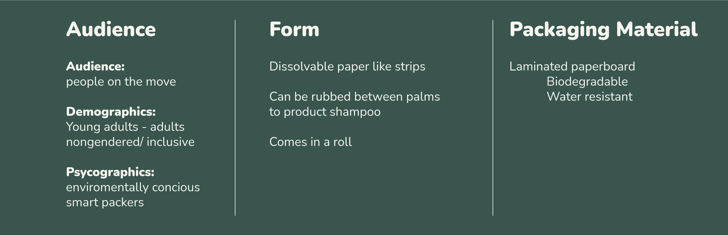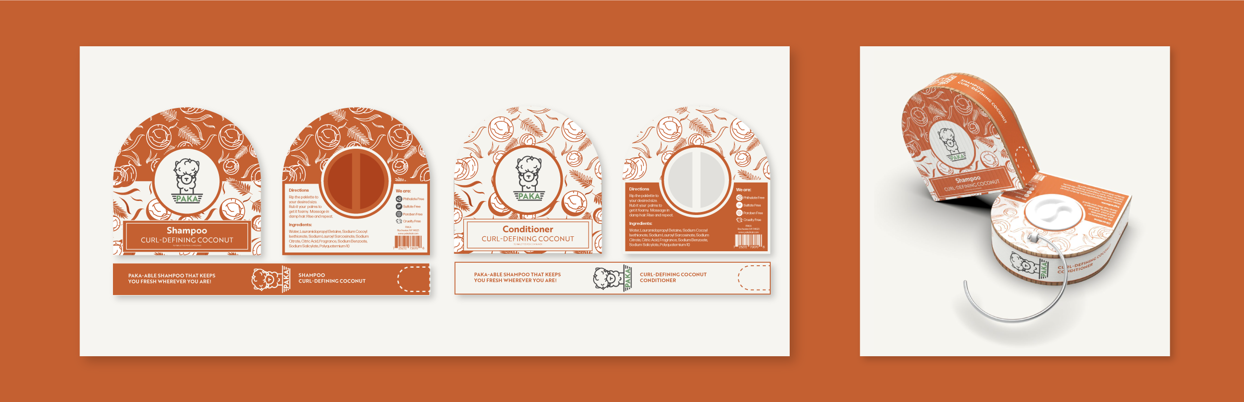 Based on these parameters and our research we decided to create a product that provided the shampoo in the form of tearable strips that could be combined with water for use. We called this product “Paka” as a fun variation on the alpaca animal, an animal known for their beautiful hair as well as their relation to travel.